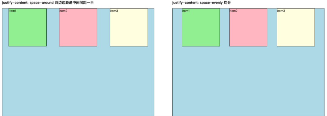 space-evenly:每根轴线两侧的间隔完全相等。