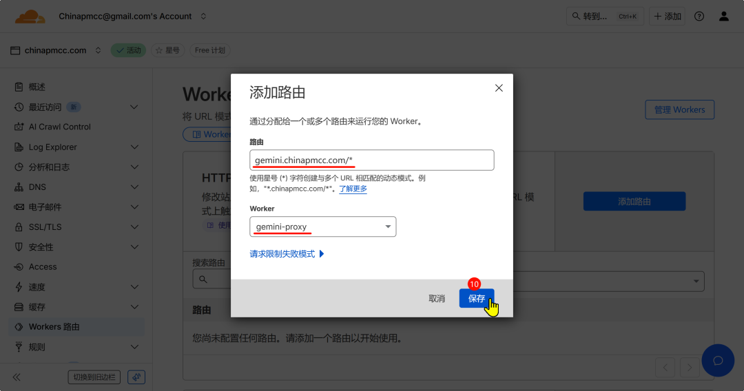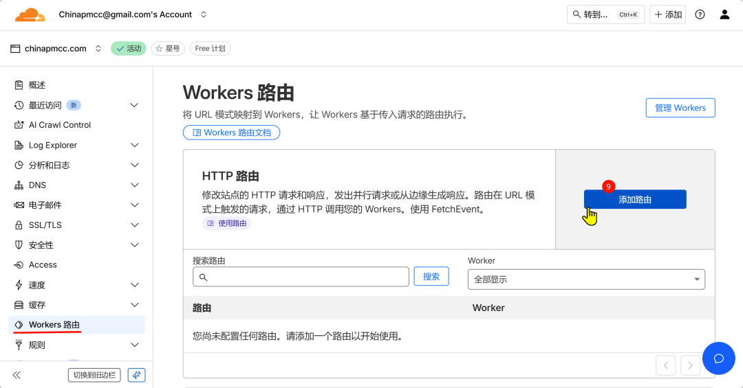 - 7. 左侧菜单Workers路由,点击添加路由按钮