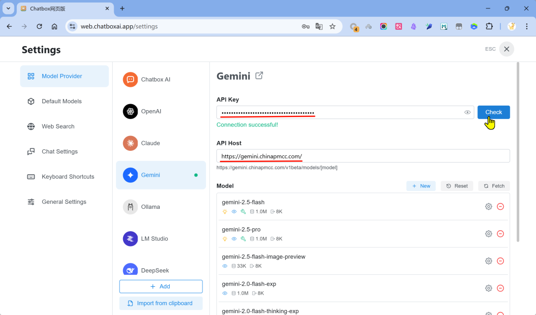 - 9. 验证并应用,配置时用到两个东西:API KEY、API 地址 经过上述配置,就可以使用Gemini了,下面通过两个应用例子验证,在其他应用中使用也是一样的方法。