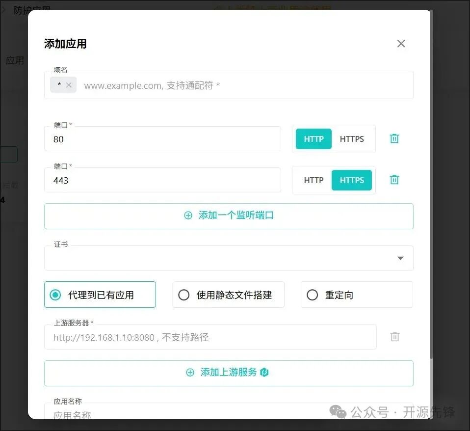 在“防护应用”模块可以添加需要防护的应用并进行配置,开源君搭建的8888端口页面就是在这里进行配置的。