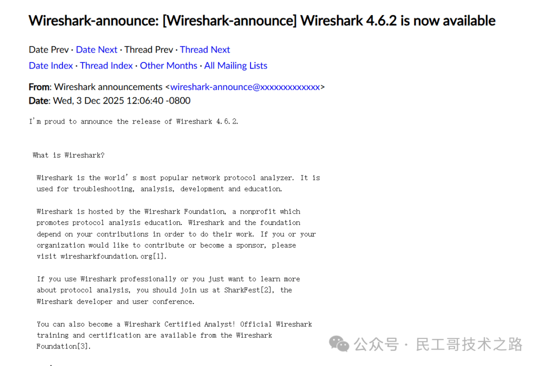 此次更新不仅解决了中等风险的代码执行与拒绝服务漏洞,还显著提升了 HTTP3、MEGACO 等新兴及工业协议的解析精度,同时通过配置迁移与性能调优支持,确保升级过程平滑无忧。 无论是企业网络运维、安全研究还是工业控制分析,Wireshark 4.6.2 均以更成熟的姿态助力用户应对复杂网络环境挑战,堪称网络分析领域的“稳定基石”。 #网络 #数据包分析 #网络数据抓包 #网络故障排查 #网络分析 #开源 #协议解析 #网络运维 #网络工程师 #流量分析 阅读原文:原文链接 该文章在 2026/1/4 18:34:25 编辑过 |