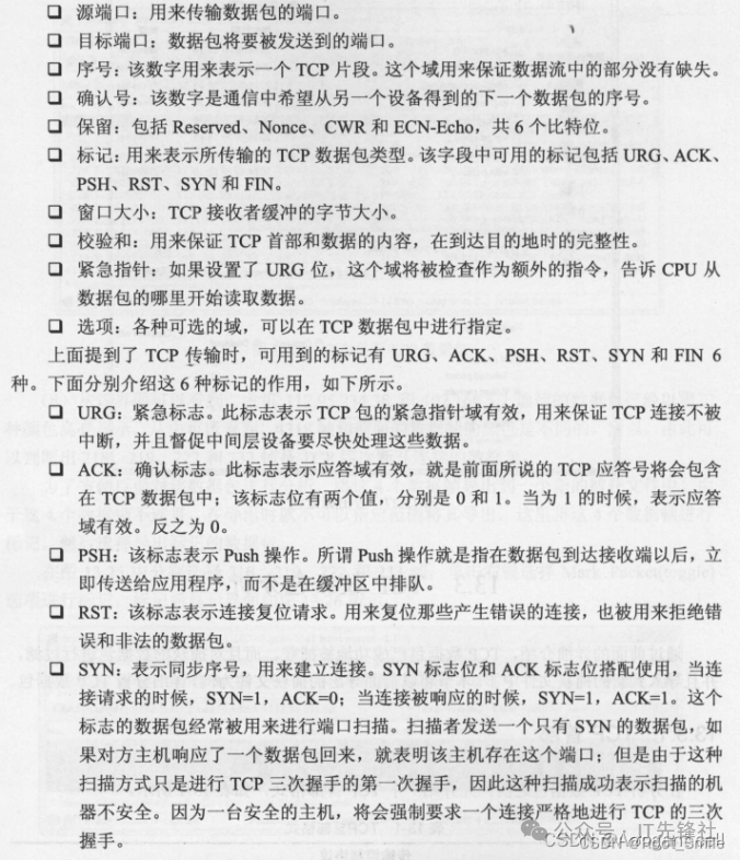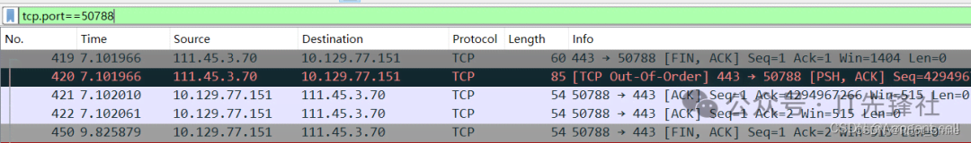 ![]() ![]() ![]() ![]() ![]() ![]() 2.捕获选项设置点击 捕获-->选项,取消勾选“在所有接口上使用混杂模式”,为了方便后续的抓包分析并排除干扰项,您可以选择安装自己所需的网卡,比如WLAN,然后点击确认完成此操作;当然,此步骤并非强制执行,您可以根据个人需求来决定是否执行。 ![]() 3.抓包分析ARP (Address Resolution Protocol)协议,即地址解析协议。该协议的功能就是将IP地址解析成MAC地址。 接下来,我们可以通过命令提示符(cmd)来执行ping操作,向一个指定的IP地址发送数据包。为了便于测试网络的连通性,我们通常建议选择同一局域网内的IP地址进行测试。但在此示例中,为了展示如何使用该命令,我们将以ping www.douyin.com 为例进行操作,具体步骤如下: ![]() Wireshark中arp协议的解析: ![]() ![]() ![]() ![]() 4.IP协议抓包分析互联网协议IP是Internet Protocol的缩写,中文缩写为“网协”。IP协议是位于OSI模型中第三层的协议,其主要目的就是使得网络间能够互联通信。前面介绍了ARP协议,该协议用在第二层处理单一网络中的通信。与与此类似,第三层在功能上承担着跨网络通信地址的管理职责。在这一层级中,多种协议并行工作,其中最为广泛使用且至关重要的协议便是互联网协议(IP)。 ![]() 在Wireshark中,我们已经成功捕获了相当数量的数据包,接下来可以通过应用过滤器 ![]() ip协议抓包分析 ![]() 在所述内容中,Internet Control Message Protocol 通常被称为 ICMP 协议,用于描述相关的协议数据包信息。 ![]() ![]() 5.TCP协议抓包分析TCP (Transmission Control Protocol,传输控制协议)它是一种以连接为导向、具备高度可靠性以及基于IP协议的传输层协议。其核心宗旨在于为数据传输建立可靠的端到端通道。TCP协议在RFC793文档中被详细规定,并且在OSI参考模型中运行于第四层。该协议不仅能够有效管理数据的传输顺序,还能够执行错误恢复机制,最终确保数据能够准确无误地送达目的地。但是,该协议的过程比较复杂。 TCP三次握手 ![]() 1.第一次握手 (1)服务器收到了客户端的请求,向客户端回复一个确认信息(Ack=x+1)。 3.第三次握手 TCP四次挥手 ![]() 为了捕获网络数据包,我们首先需要启动Wireshark软件。如果初始状态下没有数据显示任何数据包,可以通过在浏览器中加载一个网页来触发数据流。例如,可以访问百度首页,点击新闻分类下的某个链接以打开一个新闻页面,随后关闭该页面。此时,在Wireshark中应该能够捕获到大量的网络数据。为了更精确地查看HTTP相关的数据,可以在Wireshark的过滤器栏中输入"http"作为过滤条件。 ![]() 选中一个http记录,右键—>追踪—>tcp流,即可看到一个完整的tcp三次握手。 ![]() 完整的TCP三次握手如下: ![]() TCP协议抓包包分析: ![]() ![]() 第二次和第三次握手的字段内容与第一次握手的字段内容大体一致,主要的差异在于Ack和Seq这两个字段的取值有所不同。 ![]() ![]() ![]() ![]() TCP协议的四次挥手过程与三次握手阶段在基本原理上具有相似性,我们可以利用过滤器 tcp.flags.fin==1 来定位识别出用于发起挥手动作的数据包。 ![]() 为了分析端口号有来有回的数据包,我们将首先监控并捕获这些数据包,然后利用过滤器 tcp.port==50788 对捕获到的数据包进行筛选,最终目的是找出并识别出完整的四次挥手过程。 ![]() 6.UDP协议抓包分析UDP是User Datagram Protocol (用户数据报协议)的简称。它是OSI七层模型中一种无连接的传输层协议,提供面向事务的简单的不可靠信息传送服务。 ![]() ![]() 7.ICMP协议抓包分析ICMP (Internet Control Message Protocol,网际报文控制协议)是Internet 协议族的核心协议之一,它主要用在网络计算机的操作系统中发送出错信息。例如,提示请求的服务不可用、主机或者路由不可达。ICMP协议依靠IP协议来完成其任务,通常也是P协议的一个集成部分。ICMP协议和TCP或UDP协议的目的不同,它一般不用来在端系统之间传送数据。它通常不被用户网络程序直接使用,或者是像Ping 和 tracert这样的诊断程序。 进行抓包,启动Wireshark,通过cmd命令ping一个ip,如ping www.douyin.com。 ![]() 回到Wireshark中利用过滤器输入icmp进行筛选即可,分析如下: ![]() ![]() ![]() ![]()