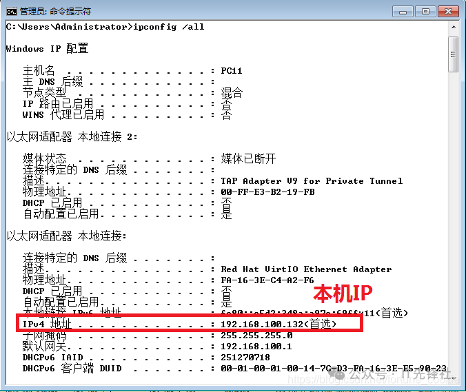 第三步,通过显示过滤器得到先关数据包:通过抓包获得大量的数据包,为了对数据包分析的方便,需要使用过滤器,添加本机IP地址和IP协议过滤条件。 (1)打开命令提示符,通过ipconfig /all来查看本机IP地址。