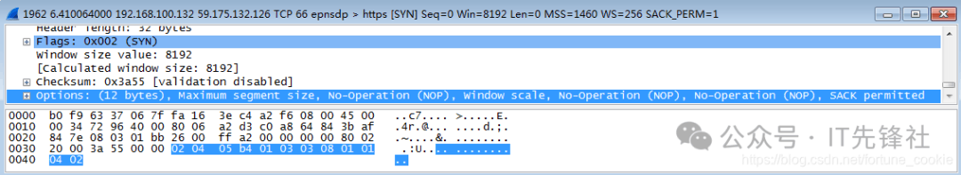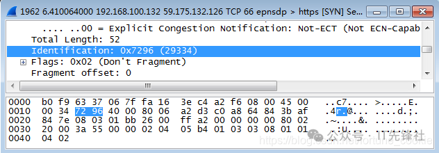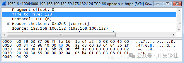 双击点击一条tcp报文进入详细信息,那为什么不选Protocol类型为IP的协议呢? 答案是没有,tcp报文正是基于ip协议的,tcp是传输层协议,而ip是它底下的网络层协议。 第四步,分析IP数据包,根据图中的数据帧格式,分析IP包的各部分。