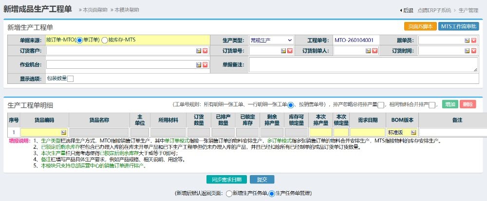 买进原材料之后,我们需要进行产成品的生产,并对生产进行发料、补料、退料等操作,需要通过点晴模切ERP系统的生产订单、生产领料单、生产补料单、生产退料单、生产入库单等单据进行一个操作。