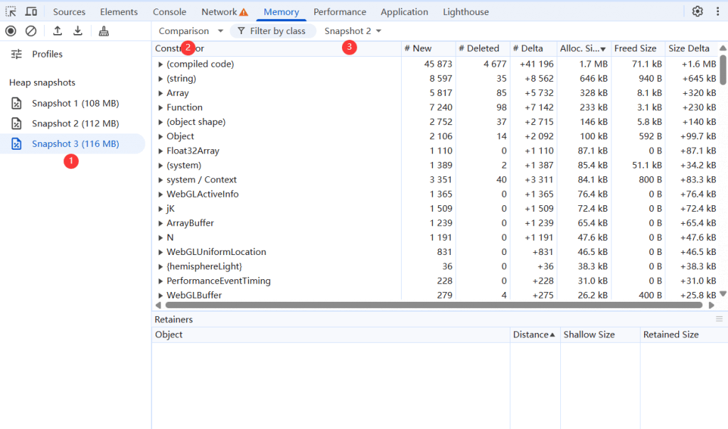 1、使用对比视图 在完成以上的操作步骤后,选择第三个快照,并在顶部的视图选择器中(下图 ②),将视图模式从 Summary 切换为 Comparison,比较对象选择为快照 2(下图 ③)。现在视图只会显示快照 2 和快照 3 之间发生变化的对象。操作后需要关注以下内容: