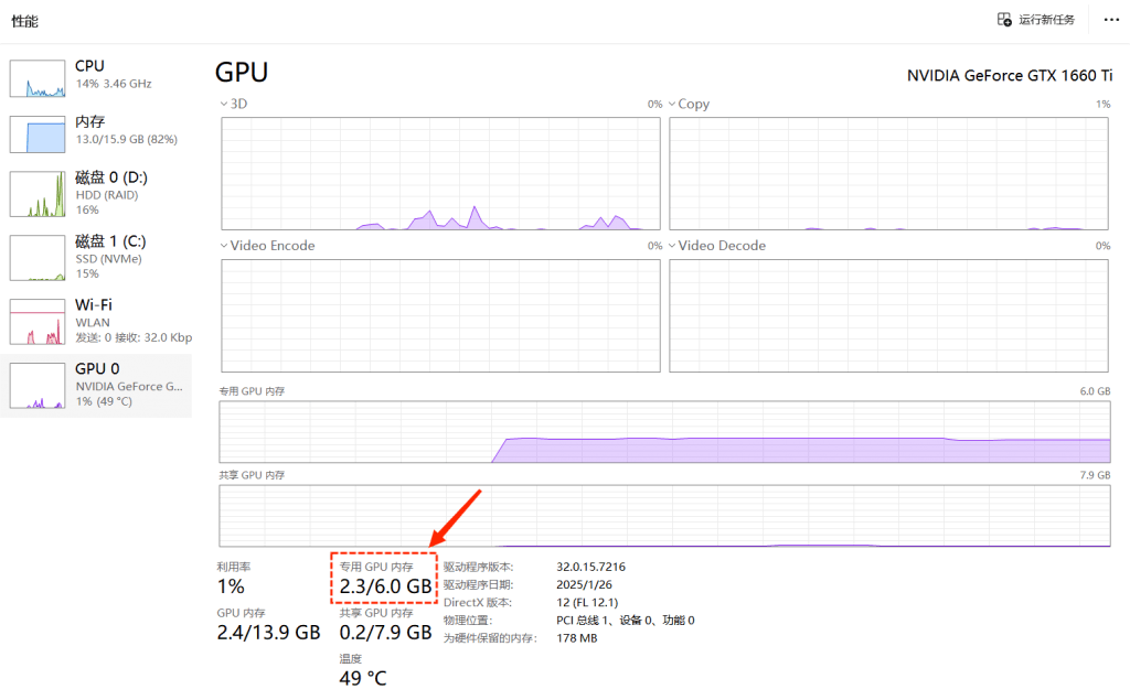 一个标准的 WebGL 资源生命周期应遵循“创建-绑定-使用-解绑-删除”的模式。GPU 显存泄漏并非浏览器的“缺陷”,而是开发者未能遵守这一显式契约的结果。 HT 中的 graph3dView 提供了专门的 dispose 方法,当 3D 场景确定要释放的时候,主动调用 g3d.dispose() 将会彻底把当前的所有跟 WebGL 相关的 GPU 资源彻底释放。 查看这类资源占用,通常需要观察系统显卡的显存使用情况。以 Windows 系统为例,可以通过:「任务管理器 → 性能 → GPU → 专用 GPU 内存」这一路径,直观地看到显存占用的变化趋势。以一个 6G 显存的 GPU 为例,尽量将显存占用控制在合理范围(譬如 5G 以内,避免超过 5.5G),否则一旦超标,系统可能会强制回收显存资源。 原生堆:理解 Blink 的 Oilpan GC分析完应用层的内存问题,我们的视线将最终聚焦于浏览器的 C++ 底层核心 ——Blink 渲染引擎。 Blink Oilpan GC 是 Chromium 浏览器引擎 Blink 中用于管理 C++ 对象内存的垃圾回收 (Garbage Collection, GC) 系统。Oilpan 采用的是一种先进的并发标记与增-量清除 (Concurrent Marking and Incremental Sweeping) 垃圾回收机制。这种机制的核心思想是尽可能地将垃圾回收的工作与主线程 (main thread) 的任务(例如 JavaScript 执行、页面布局和渲染)并行处理,从而最大限度地减少因 GC 而导致的页面卡顿 (jank)。 通常这块内存由 Blink 底层管理,Web 应用层是无法干预的,这里我们通过一个实际案例来展开说明:JS 堆快照显示其 24 小时动画运行后内存增长微乎其微,但 Windows 资源监视器却显示 Chrome 进程占用了 4GB 内存。这种悬殊的差距,让人不禁好奇。