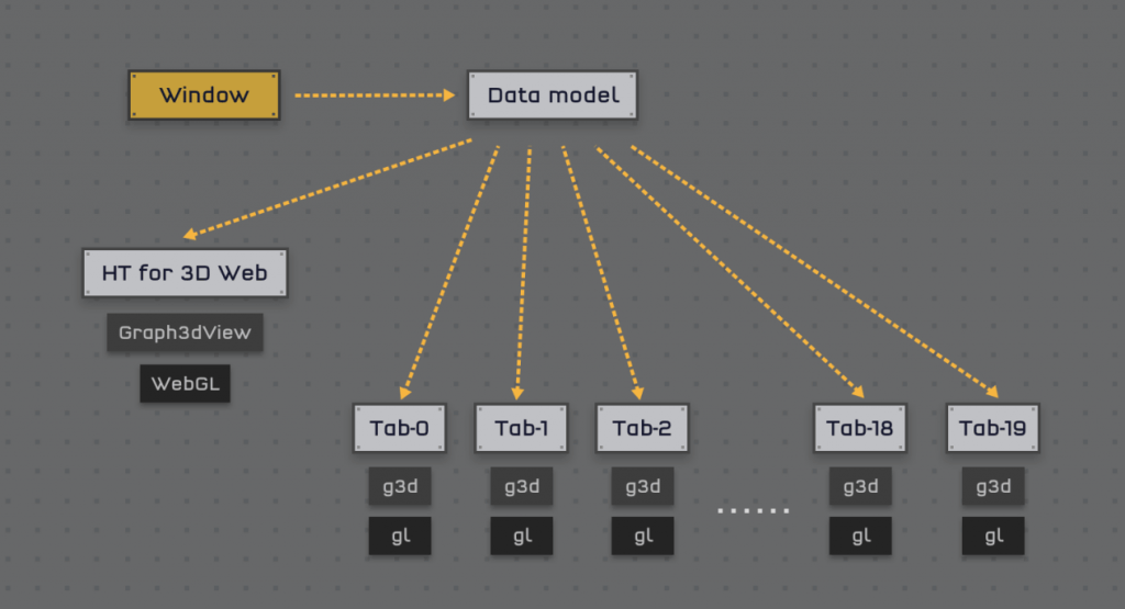 从上图可见,blink_gc 占用 4GB 内存,这可能并非内存泄漏,而是 Blink 的 Oilpan GC 策略导致的正常现象。其核心机制是内存池化 (Memory Pooling):Blink 会预先向操作系统申请大块的连续内存区域。页面中几乎所有的 Blink C++ 对象(包括大量临时的字符串、数组等)都在这个大内存池中进行分配,以提升效率。 当这些短生命周期的对象不再被引用时,它们在逻辑上被视为“垃圾”,但它们所占用的物理内存并不会立即归还给操作系统。GC 回收器会根据当前的内存压力 (Memory Pressure) 来决定何时执行彻底的清理。 在本案例中,机器总内存高达 64GB,资源充裕,Chrome 判断无需迫切回收。为避免不必要的性能开销(一次完整的 GC 会消耗 CPU 资源),GC 选择推迟回收操作。因此,我们看到的 4GB 占用,实际上是 Oilpan GC 持有的一个较大的内存池,其中包含了活动对象和大量待回收的“垃圾”对象。只要这个内存池的大小趋于稳定,没有出现持续、无节制的增长,通常就不构成内存泄漏问题。 HT 与内存泄露综合上述的三部分内容,我们捋清了内存泄漏问题的主要原因,并掌握了对应的排查方法。而在 HT 框架中,内存泄漏的问题在 3D 场景中最为常见,由于 HT 的 3D 是基于 WebGL 实现的,此类泄漏往往会表现得尤为明显。 为了清晰呈现 HT 3D 中的内存泄漏问题,我们设计了一个简单的对照实现来进行演示。 对照实验 在展开实验前,我们先简要了解下 HT 框架的核心架构。HT 采用 MV 架构模式,在 HT 的框架设计中, Data 模型和 View 视图是分离的,二者之间通过 Event 事件监听和派发机制来建立起数据绑定。 在实验操作前,我们可以打开 Chrome DevTools -> Performance (性能) 面板,并且点击面板中的录制按钮,记录整个实验过程,这能帮助我们在操作结束后,回溯并分析全程性能和内存的变化情况。 实验环境: 浏览器:Chrome 138.0.7204.101(64位) 显卡:NVIDIA GeForce GTX 1660 Ti 处理器:Intel(R) Core(TM) i5-10400F CPU @ 2.90GHz (2.90 GHz) 第一次实验 我们通过按钮不断创建新的视图,当页面中超过一定数量Graph3dView 时,可以看到第一个场景“崩溃”,但是当我们删除最后一个 Graph3dView 后,第一个场景又恢复了。 我们可以从 Performance 面板中观察到整个过程: