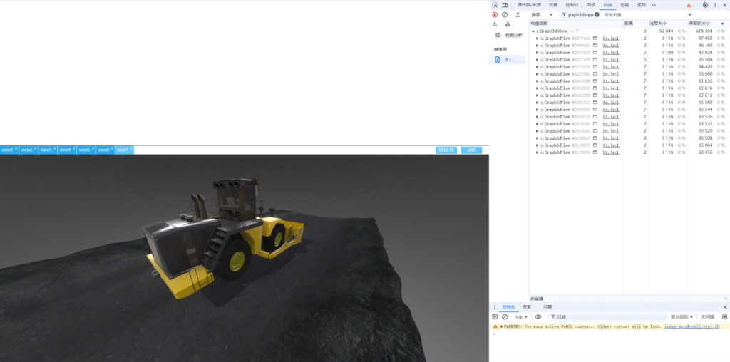 第二次实验 我们将所有的 Graph3dView 都绑定到一个 window.dataModel 上。具体可以参考下图: 同实验一,我们也通过按钮创建多个视图,在告警后删除最后一个视图。可以发现,当删除了最后一个 Graph3dView ,第一个场景也并没有恢复。 我们从 Performance 面板中观察到整个过程: