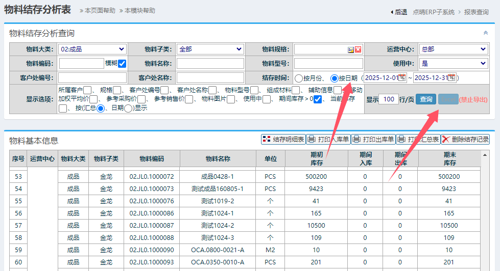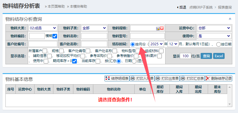 点晴ERP系统中支持按照月份和时间范围来查看物料历史库存,查看位置:报表查询-》物料结存分析表