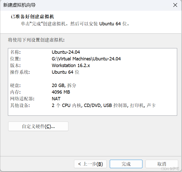 点击「完成」→ 进入虚拟机设置(可先不启动,优化配置)。