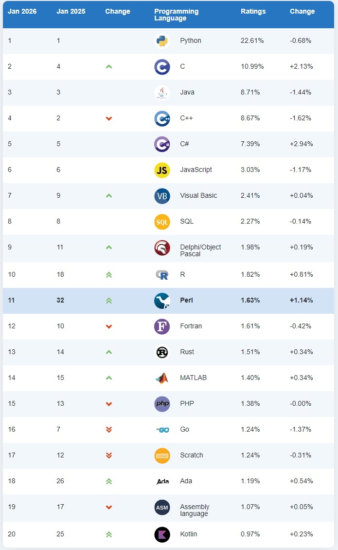 C# 获评 TIOBE 2025 年度编程语言,Python 稳居榜首 网址:https://www.tiobe.com/tiobe-index/ TIOBE 公布的数据显示,C# 凭借 2.94% 的年度最高涨幅,继 2023 年后再次获评“2025 年度编程语言”。目前 C# 位列榜单第 5 位。在最新排名中,Python 以 22.61% 的份额稳居第一。C 语言超越 C++ 升至第 2 位,Java 与 C++ 分列第 3、4 位。此外,R 语言重返前 10,Perl 升至第 11 位;Go 语言跌出前 10 位列第 16,Ruby 则跌至第 27 位。该指数主要通过全球工程师数量、课程及主流搜索引擎数据衡量编程语言普及度。 该文章在 2026/1/10 13:04:19 编辑过 |