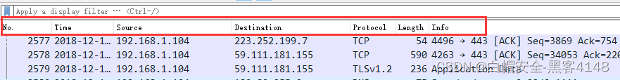 ip.src == 192.168.1.104:显示源地址为 192.168.1.104 的数据包。ip.dst == 192.168.1.104:显示目标地址为 192.168.1.104 的数据包。ip.addr == 192.168.1.104:显示源 IP 地址或目标 IP 地址为 192.168.1.104 的数据包。