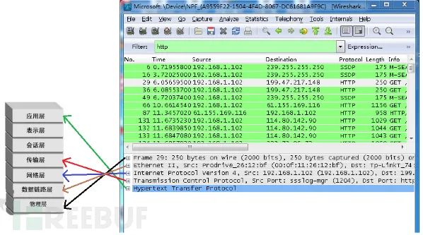 网络层次结构:从下到上依次为物理层、数据链路层、网络层、传输层、应用层(图中顺序为从上到下)。
