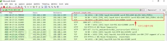 ip.addr == 211.162.2.183 获取待分析数据包列表。