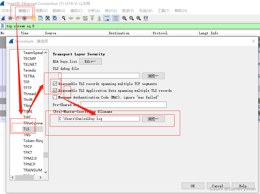配置 Wireshark:进入 Edit → Preferences → Protocols → TLS,在 “(Pre)-Master-Secret log filename” 中填入 sslkey.log 的完整路径。
