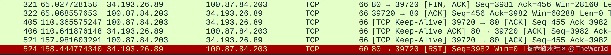 发现这并不是我们学过的完整的四次挥手,这是为什么呢? 原因就是: 服务器 65 秒先发出 FIN,我只回了 ACK,进入 TIME_WAIT。