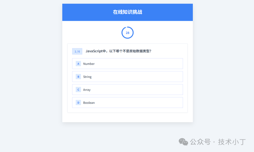 在线知识挑战系统为用户提供了一个互动性强、反馈及时的学习体验平台。通过倒计时机制增加紧张感,即时结果显示正确答案帮助用户学习,得分统计激发用户的竞争心理。这种系统特别适用于教育应用、技能评估或娱乐类游戏。本文将介绍如何使用 HTML、CSS 和 JavaScript 实现一个完整的知识挑战系统。效果演示