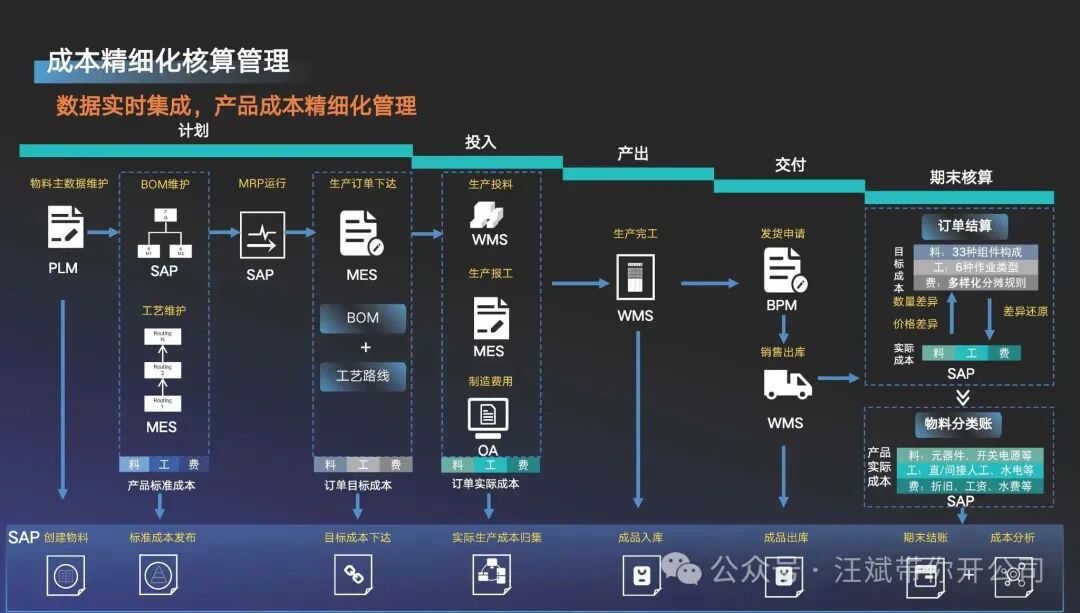 注:图片源自网络 ▲ 请看上图,就完美地呈现了当下先进的制造业成本管理已经不再是财务部门在月底关起门来做的“事后算账”,而是贯穿于从产品设计、计划、生产到交付全过程的、由实时业务数据驱动的动态管理过程,最终目标是要实现标准成本、目标成本和实际发生成本的“三算对比”,从而能够及时的赋能在一线打拼的业务同事,真正的在践行价值创造的口号! 标准成本:产品应该花多少钱?(基于标准BOM和标准工艺) 目标成本:这个订单计划花多少钱?(基于当时的BOM和工艺) 实际成本:实际上花了多少钱?(基于生产过程中的实际消耗) 通过对这三者的对比分析,实现精准的成本控制和持续改进。