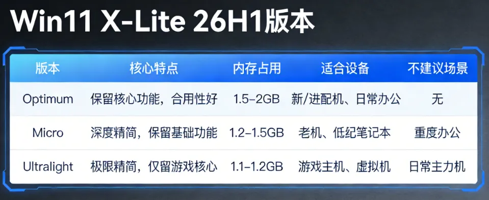 Win11 X-Lite 26H1 与Tiny11 25H2精简版系统谁好用?在如今的数码圈,“轻量化”早已成为众多用户的核心诉求。无论是希望老电脑重获新生的普通用户,还是追求极致游戏性能的硬核玩家,都对原版Windows系统中冗余的预装组件、后台进程感到困扰,而第三方精简版系统的出现,恰好精准击中了这一痛点。近期,Win11 X-Lite 26H1 与 Tiny11 25H2 两款第三方精简版Windows系统更是强势出圈,成为大家热议的焦点——前者以游戏性能优化为核心卖点,宣称能大幅提升帧率、缩短启动时间;后者则凭借亲民的硬件门槛和接近原版的稳定性,收获了大批老设备用户的青睐。 随着两款系统的下载量持续攀升,关于它们的讨论也愈发激烈:有人说Win11 X-Lite 26H1的极致精简让游戏体验翻倍,也有人认为Tiny11 25H2的兼容性更适合日常使用;有人纠结于两者的安全风险差异,也有人关心不同配置设备下的适配表现。那么,这两款火爆的精简版系统到底哪个更值得选?它们在系统占用、性能表现、兼容性、安全性等关键维度上又有怎样的差异?今天,我们就带着这些疑问,为大家带来两者的详细对比,帮你根据自身需求做出最合适的选择。 ![]() Win11 X-Lite 26H1 与 Tiny11 25H2介绍 1、Win11 X-Lite 26H1介绍: Windows X-Lite 是由 NTDEV 团队开发的第三方定制精简版 Windows 系统,主打低资源占用、游戏性能优化与老旧设备适配,基于 Windows 10/11 官方核心深度精简,非微软官方发行Windows X-Lite。 Windows X-Lite团队发布基于Windows 11 26H1的轻量化定制系统,删减非必要组件并优化设置,显著降低内存与磁盘占用。Optimum版面向日常场景,兼顾性能与兼容;Micro及Ultralight版进一步精简服务,仅保留核心,适配旧PC与虚拟机,但删减幅度大,不推荐主力使用。团队宣称镜像“100%安全干净”,因其属第三方修改,安装风险需用户自担。 版本化分: 1、Optimum版本(日常 / 兼容性): 保留核心功能与兼容性,仅精简冗余组件,既能满足3A游戏高性能需求,又能流畅应对办公、直播等日常场景,是兼顾实用与性能的“万金油”。 2、Micro(旧机): 进一步删减非必要系统服务,仅保留最核心的运行模块,适合4GB内存、512GB SSD的老旧设备,最大化释放硬件潜力,让五年前的旧PC重新焕发战斗力。 3、Ultralight( 虚拟机): 极致精简所有非必需功能,仅维持基础系统框架,资源占用最低,专为虚拟机测试、低配主机专用游戏场景设计,不建议作为日常主力系统。 https://windowsxlite.com/downloads/ 网盘分流下载:https://pan.baidu.com/s/1paFkoNAVampk2DHysQ_TCg?pwd=if2q 2、Tiny11 25H2介绍: Tiny11 25H2 是由开发者 NTDEV 基于 Windows 11 25H2 官方镜像打造的第三方精简系统,2025 年 10 月发布,核心优势是突破硬件限制、大幅精简冗余、支持本地账户,分标准版与 Core 版,适配 x64 和 ARM64 设备,适合老电脑与轻量场景。 熟悉 Tiny11 的都知道,这是基于原版 Win 11 精简定制的一个更轻量、纯情、更省心的系统,曾受到无数用户青睐。而 Tiny11 25H2 则基于最新原版 Win 11 25H2 镜像打造。它直接砍掉了大量动不动就跑后台、占用资源、我们可能一辈子都用不上的功能和组件、一堆预装 App 以及各种奇奇怪怪的服务。 版本化分: 1、标准版(标准版):老电脑日常使用、轻度办公、娱乐 约8-10GB,核心移除Copilot、新 Outlook、Teams、Edge、Xbox 等预装应用,禁用部分遥测,保留 Windows Update,可获取累积补丁,部分功能更新可能失败。 2、Core版(极限精简版):虚拟机、离线设备、测试环境,不建议主力机使用 约 3-5GB,在标准版基础上进一步移除 Windows Update、WinSxS、Windows Defender(默认禁用)、WinRE 等,完全无更新能力,不支持系统更新与恢复。 夸克网盘分流下载:https://pan.quark.cn/s/40b67b4a3ece 百度网盘分流下载:https://pan.baidu.com/s/1-nZ0gUEPv1l5YqqS8-9wDw?pwd=hbnf 提取码: hbnf Win11 X-Lite 26H1 VS Tiny11 25H2从多个角度终极对比 Win11 X-Lite 26H1 是基于 Win11 26H1 打造的游戏向精简系统,资源占用更低、游戏优化更强,有多个版本可选;tiny11 25H2 基于 Win11 25H2,主打轻量化与基础兼容性,更新与安全机制保留更完整,适合老设备日常使用。 1、核心基础信息: Win11 X-Lite 26H1:Win11 X-Lite 26H1是由NTDEV团队2026年更新,版本分为:Optimum、Micro、Ultralight三个版本。 Tiny11 25H2:是由NTDEV团队2025年更新,版本分为标准版和Core两个版本。 2、功能精简对比: Win11 X-Lite 26H1是以深度精简系统组件、彻底关闭后台服务为核心手段,专为游戏玩家及高性能场景设计的第三方优化系统,专为与所有应用程序和游戏配合使用而设计,适用于所有电脑。无论新旧、配置高低、台式机还是笔记本电脑。 绕过 TPM、安全启动、内存、CPU 和存储检查,绕过 Microsoft 在安装/设置过程中强制创建帐户。 Tiny11 25H2主要亮点就是精简,开发者将系统里的各种冗余软件删除提高系统的运行效率,并且不需要满足 Windows 11 硬件要求(绕过 TPM 强制要求)和微软账号,这对于老旧 PC 来说也是个福音。 Win11 X-Lite 26H1: •游戏优化:内置智能资源分配引擎,优先分配 CPU 算力给前台游戏,暂停后台服务;预装 DirectX 全版本、VC++ 等运行库,解决游戏组件缺失问题;优化内存压缩和 DirectStorage 解压效率,缩短关卡加载时间。 •精简内容:砍掉 Cortana、Microsoft Store、Windows Defender(可选保留),禁用遥测、广告推送等,后台进程仅 49-62 个,空闲内存占用低至 1.1GB。 •账户与部署:支持离线创建本地账户,跳过微软账号强制登录,全程无需联网,3 分钟完成部署。 Tiny11 25H2