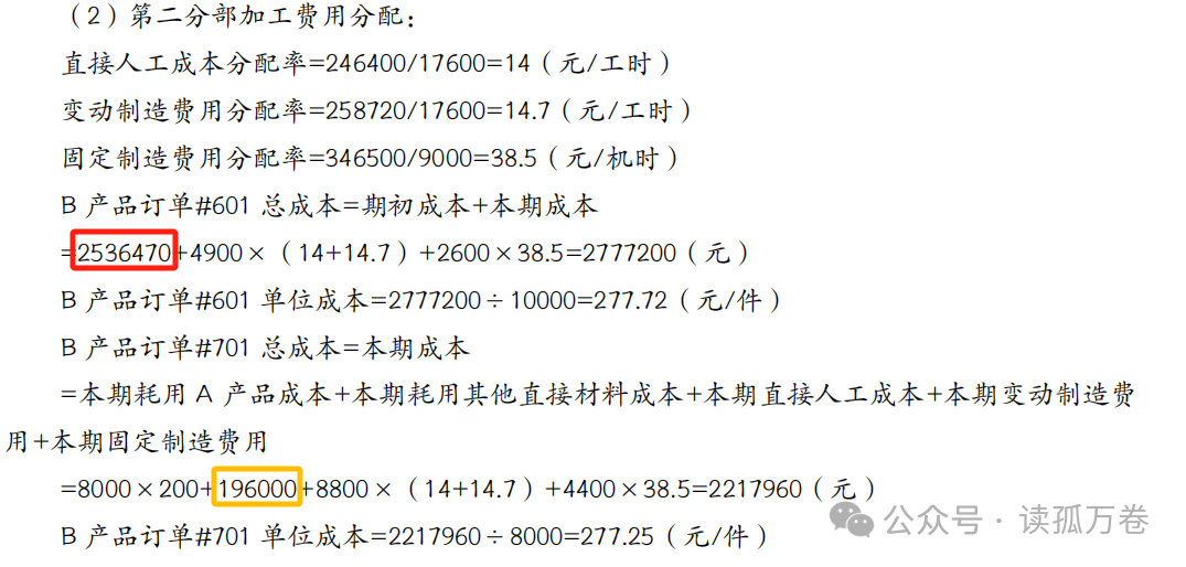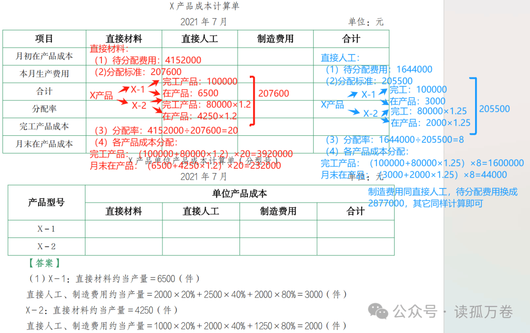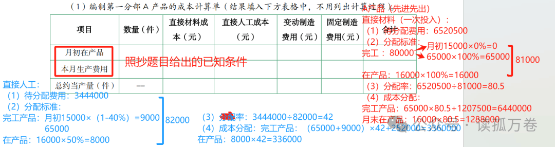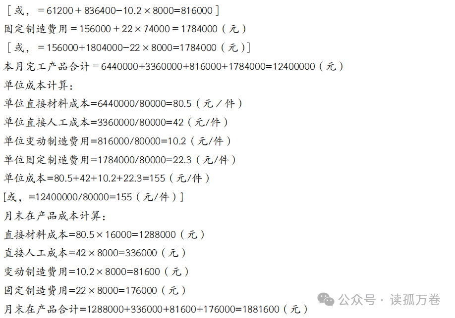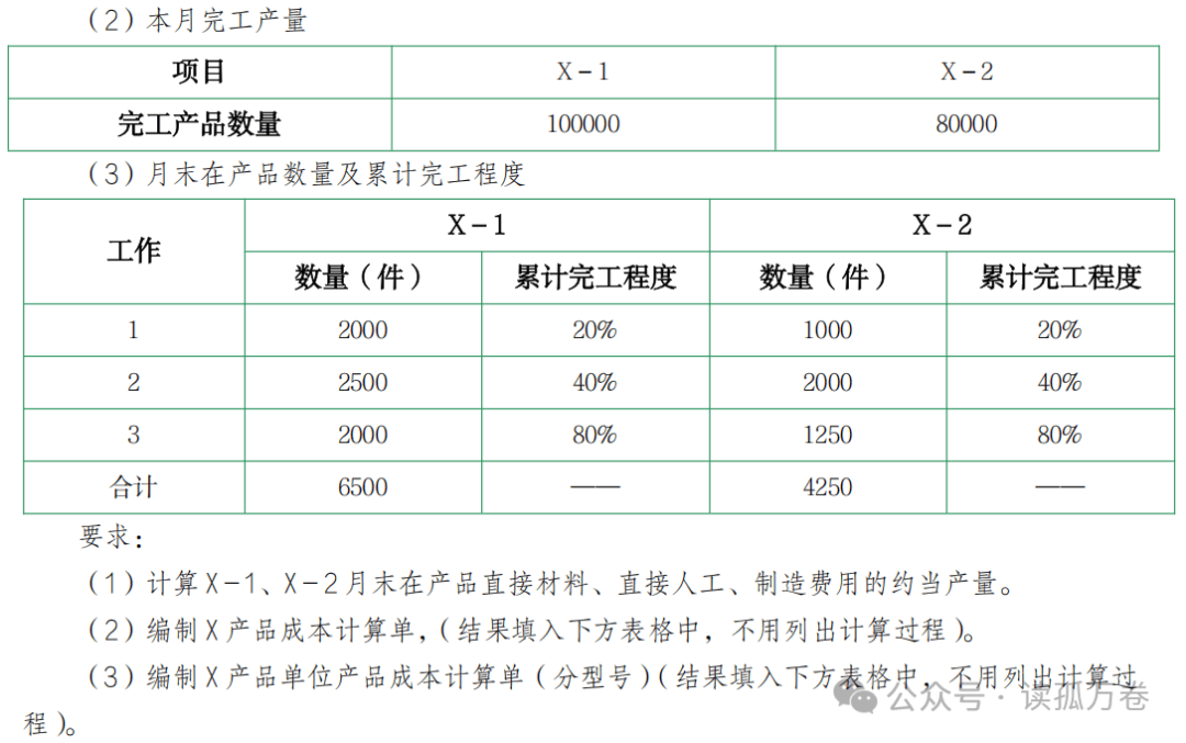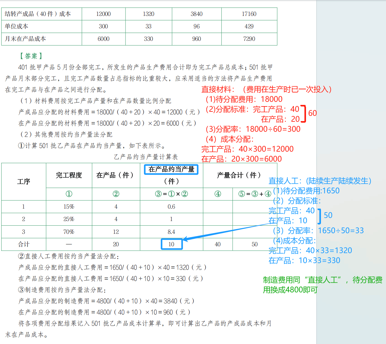 情形二:501批乙产品(特殊情形的分批法)情况:5月投产60件,当月完工40件并交货,20件未完工(即“批次内产品跨月陆续完工”)。 处理:由于客户提货(或管理需要),必须对已完工的40件计算并结转成本。这就不得不将累计的生产费用在40件产成品和20件在产品之间进行分配。例题采用了以下方法: 1、材料费用:按完工产品和在产品的数量比例(40:20)分配。这隐含了“原材料在生产开始时一次投入”的假设,因为分配基础是实物数量,而非约当产量。 2、其他费用(直接人工、制造费用):按约当产量法分配。这隐含了“加工成本(工、费)随生产进度均匀发生”的假设,因为需要计算在产品的完工程度(例题给出了各工序的完工程度)。 特点:分批法在特殊情况下,在完工产品与在产品间进行费用分配。 【关联习题】