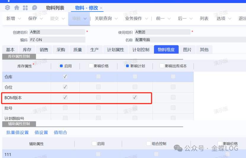 这个物料就是后面要用来创建配置产品BOM的父项编码(下面第五步)。 这种属性的物料系统会强制为它启用BOM版本管理和计划影响,因为后续所有配置出来的具体产品,都会以“这个编码+不同的BOM版本号”的形式来管理,并参与后续的MRP计划、库存管理等所有业务。