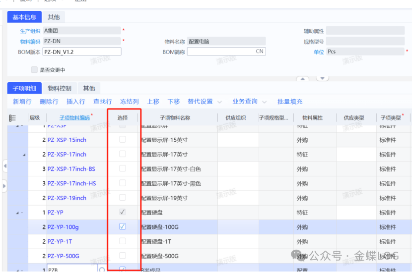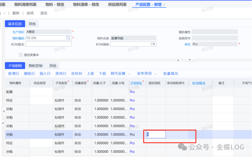 第五步:给【配置】件料号创建BOM 新增物料清单时,父项料号选择第一步创建的配置物料,子项可以包含:特征件和外购件或自制件;这里额外加上了两个直接外购的鼠标和键盘物品,它俩不需要选配。