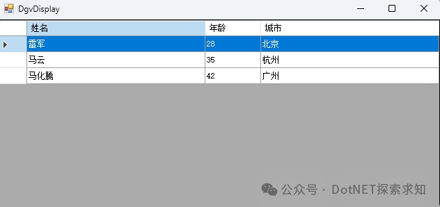 var cityColumn = new DataGridViewTextBoxColumn { DataPropertyName = "City", HeaderText = "城市", AutoSizeMode = DataGridViewAutoSizeColumnMode.Fill }; dgv.Columns.Add(cityColumn); } private void BindData(DataGridView dgv) { var people = new List<Person> { new Person { Name = "雷军", Age = 28, City = "北京" }, new Person { Name = "马云", Age = 35, City = "杭州" }, new Person { Name = "马化腾", Age = 42, City = "广州" } }; dgv.DataSource = people; } } public class Person { public string Name { get; set; } public int Age { get; set; } public string City { get; set; } }}