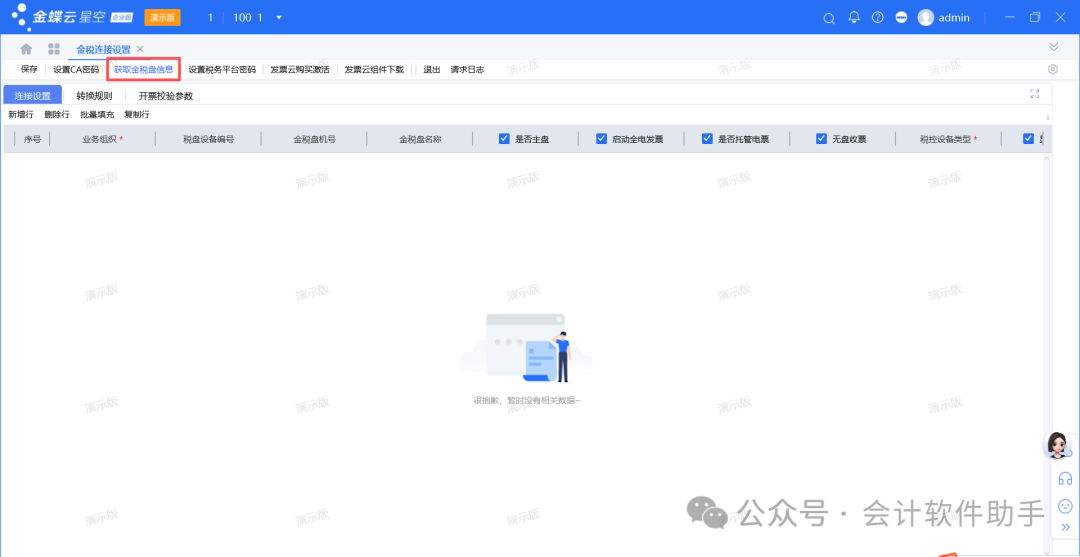 (2)操作步骤:点击打开金税连接设置,选中需要配置的行,点击获取金税盘信息,会直接跳到获取税盘界面(包含金税盘相关的信息:金税盘机号、税盘设备编码、企业名称、税号、开票限额等信息),然后点击保存;