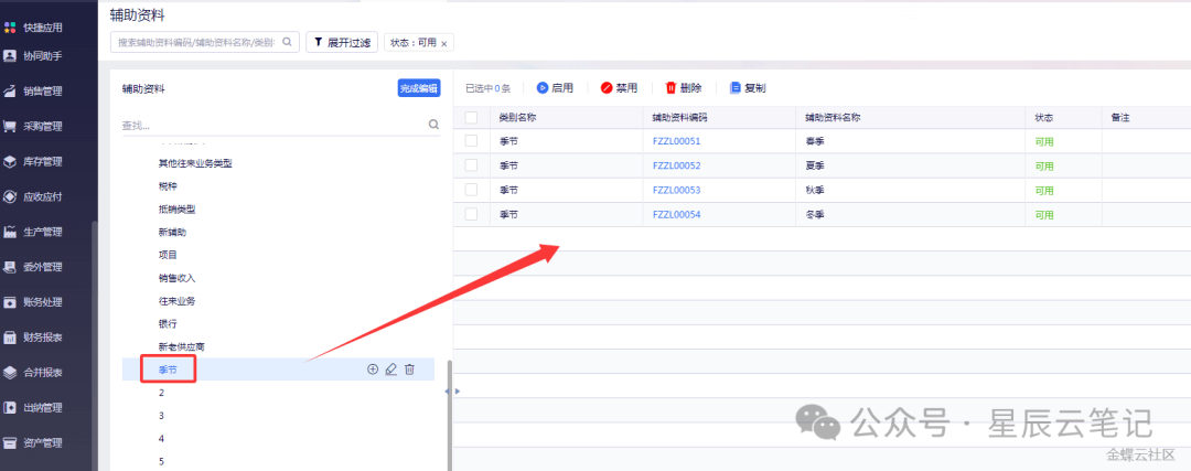 7、为什么自定义字段选择“引用辅助资料”后,“值来源”里没有可选项?它的作用是什么? 【解决方案】 “引用辅助资料”里的“值来源”是引用的《辅助资料》里由用户手工添加的分类,不包括系统内置的分类。 “引用辅助资料”用于处理需要下拉选择某些指定项目的场景,在实际应用中,用户可根据需要来设置。 比如服装行业一般会区分商品的季节,若要在商品中展现 (1)需要先在辅助资料中,新增“季节”的分类,然后在这个类别下面,建立具体的项目,如春季、夏季、秋季、冬季。