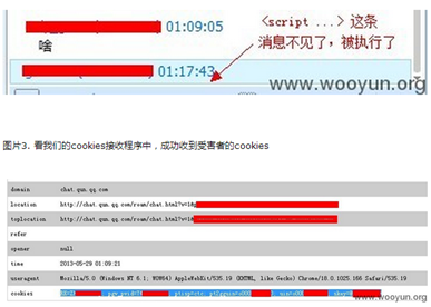 漏洞链接:QQ客户端某功能存储型xss 附加说明:以上漏洞为同一漏洞,两人先后报告 场景12: QQ其它功能篇之聊天记录 嗯,没事不要翻聊天记录,翻着翻着,你的cookies就被偷去了!