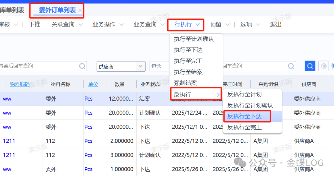 场景二:工单材料领用数量按实际入库数量发的 直接新增一张新的委外订单,将剩下未领用的材料在新的工单上发料,然后正常下推采购订单进行入库。