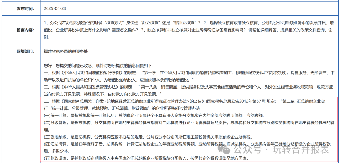 (1)分公司不同于子公司。子公司注销后,一般情况下,母公司承担有限责任;分公司注销后,总公司则无法规避分公司的债务。 (2)法律层面,总公司对分公司的债务,承担共同责任。 (3)财务层面,分公司既没有实收资本,也没有资本公积,也不计提盈余公积,所有者权益只有未分配利润,不存在所有者权益的抵消。 (4)分公司注销后,总公司将分公司的资产、负债、年初未分配利润、当期利润,通过分录的形式调整到总公司。(处置类似于子公司的处置的逻辑) 那么总、分公司有哪些合并抵销呢? 内部交易例题:2023年12月31日,总公司将账面金额为800万元的存货,以1,000万元的价格出售给分公司。(或分公司出售给总公司) 1、2023年12月31日合并的调整分录,收入、成本、存货的抵消: 借:主营业务收入 1,000 贷:主营业务成本 800 贷:存货 200 2、2024年出售50% (1)以前年度调整 借:年初未分配利润 200 贷:存货 200 (2)分公司单体确认成本500,然而站在总公司合并的基础上账面只有400,因此需要冲掉100,总公司合并抵销如下: 借:存货 100 贷:主营业务成本 100 注:这里没有考虑递延所得税,所得税一般由总公司汇总计算,不存在税会差异。 以下为福建税务总局关于总分公司所得税问题的答复,简而言之就是:统一计算、统一申报。 https://fujian.chinatax.gov.cn/fzsswj/gzcy/nszx/detail.htm?id=93678