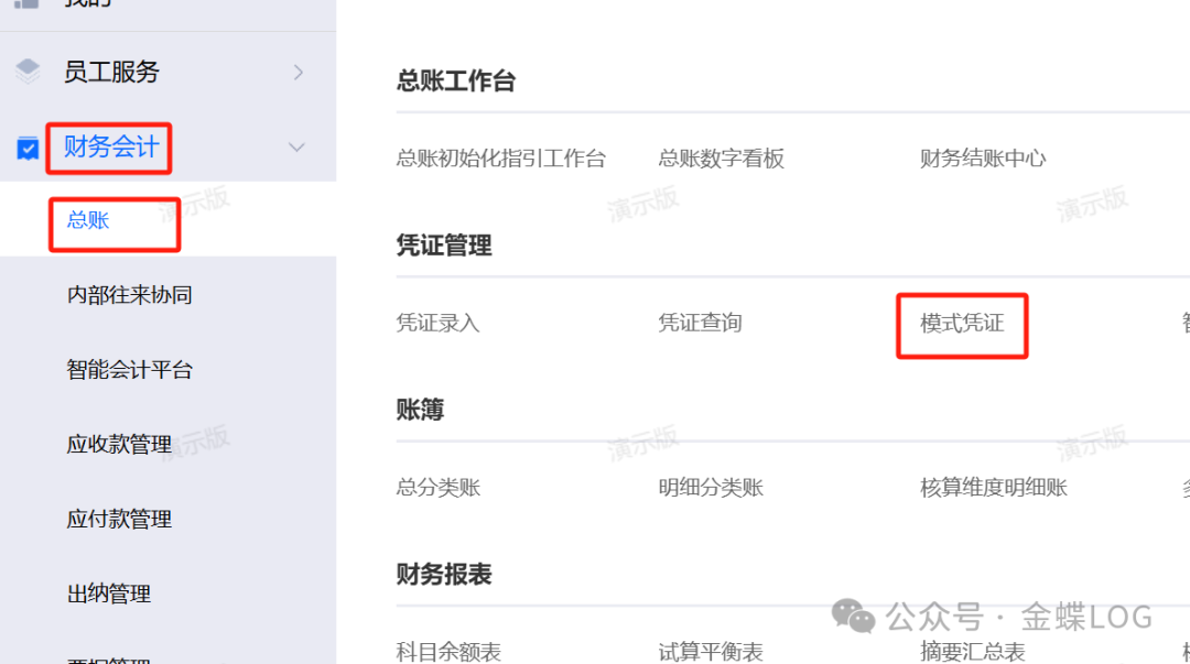 ②模式凭证新增路径:财务会计-总账-模式凭证 公司有一些凭证的科目、摘要每个月都是固定的,这个时候就可以使用模式凭证功能,提前把凭证分录做成模板。