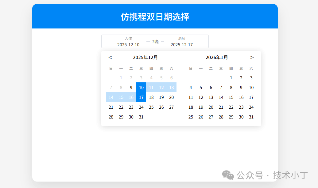 table td:hover:not(.disabled):not(.old):not(.new) { background: #4daaf8; color: #fff; } </style></head><body><div class="container"> <div class="header"> <h1>仿携程双日期选择</h1> </div> <div class="main"> <div class="date-bar" id="dateBar"> <div class="item"> <div class="label">入住</div> <div class="val" id="checkInStr">请选择日期</div> </div> <div class="val" id="nightCount">0晚</div> <div class="item"> <div class="label">退房</div> <div class="val" id="checkOutStr">请选择日期</div> </div> </div> <div class="modal-wrap" id="calendarWrap"> <div class="modal-bd" id="calendarBox"></div> </div> </div></div>