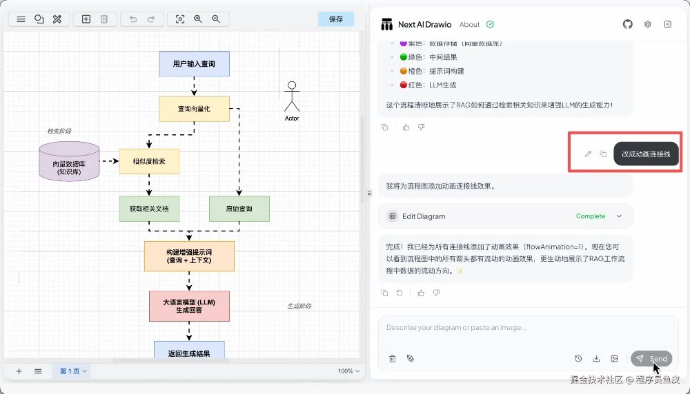这个项目支持在线体验,你可以完全从 0 开始画图,比如画一个流程图,演示 RAG 的工作原理。 ⭐️ 建议观看视频演示:bilibili.com/video/BV18N… AI 会自动生成 Draw.io 绘图代码,很快精美的流程图就搞定了!