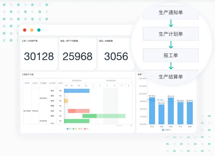统筹生产流程,确保生产高效进行。在线制定生产计划,各工序责任到人,前后工序无缝对接;所有生产数据实时更新到看板,管理层可以快速了解全公司、各环节的生产情况。