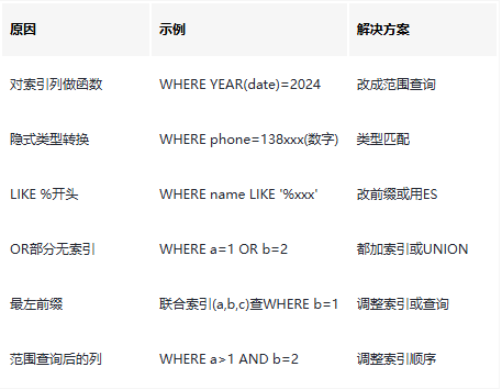 范围查询(>、<、BETWEEN、LIKE)会导致后面的列无法使用索引。