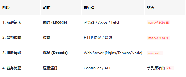关键结论: 后端框架(Spring Boot, Express, Django 等)在将请求交给你的业务代码(Controller)之前,通常已经自动完成了 URL 解码。 如果你在数据库里存入了这个值,存进去的是 5. 前端开发实战指南在 JS 中手动处理 URL 编码时,请务必区分这两个 API: