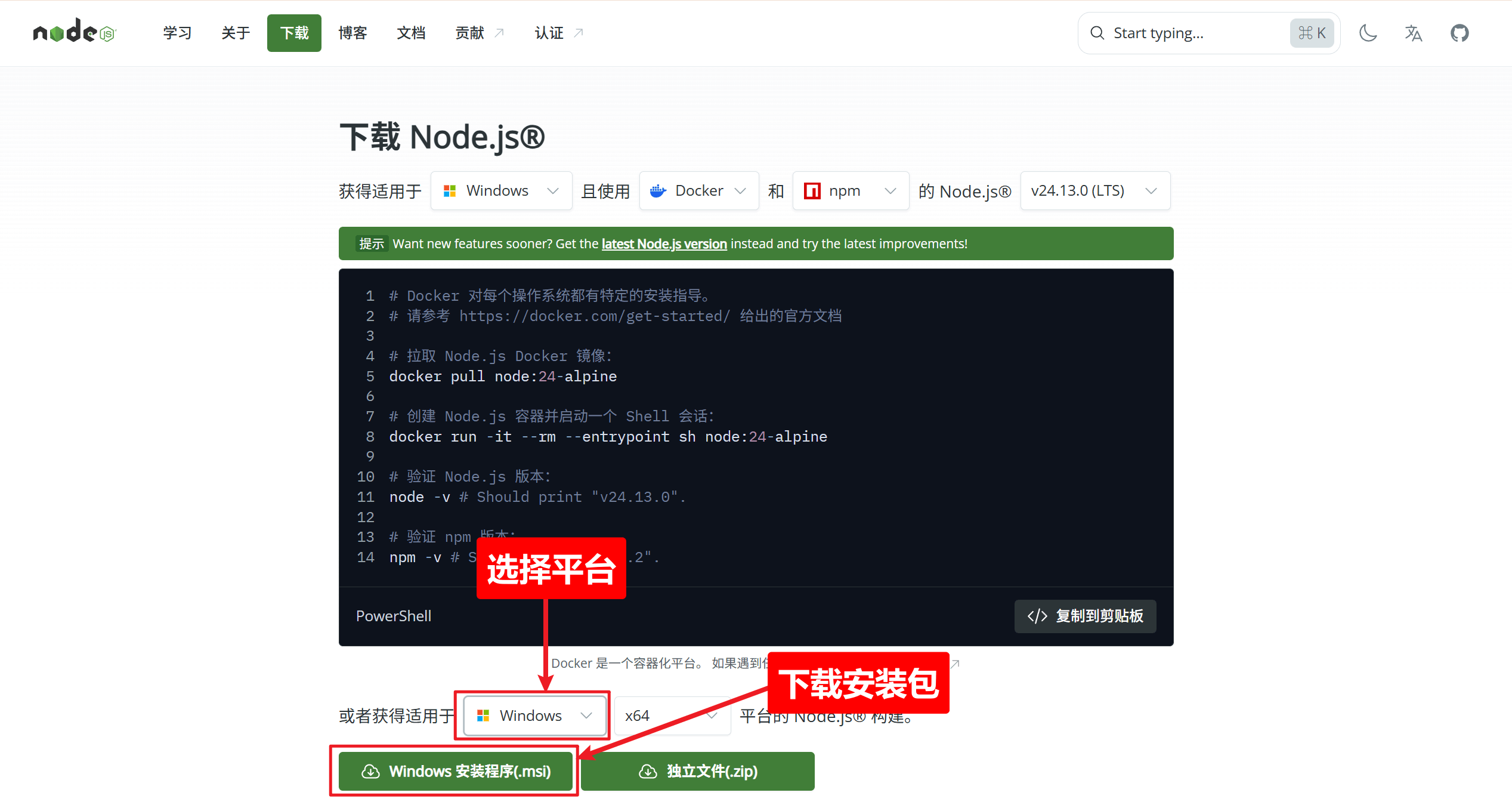 它能做什么? 它不只是回答问题的聊天机器人,而是真的能在你电脑上动手操作。比如你告诉它“帮我整理一下上个月的邮件”,它就默默去处理了;你睡觉时,它还能继续干活,退订广告、预约行程、甚至找找 Bug。 它完全免费,你的数据都在自己手里。而且可以用钉钉,飞书,WhatsApp、Telegram等各类即时通讯软件来指挥他干活! 简单来说,一句话交给它,从整理桌面文件到控制家里灯光,它都默默帮你搞定。是你电脑里真正的贾维斯!超级智能的AI助理! 二、安装nodejs后面执行一键安装命令,可以自动安装nodejs,但是如果为了加快速度,防止安装意外,可以先安装nodejs: 官方下载地址:https://nodejs.org/zh-cn/download 三、开始安装一)设置 PowerShell 执行权限以管理员身份运行 PowerShell: