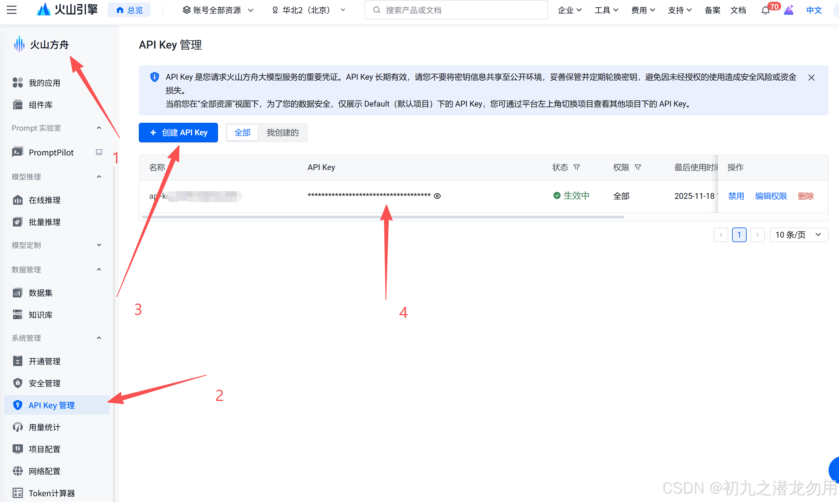 选择火山方舟 -> API Key 管理 ->  创建 API Key 即可,请注意编辑权限以保证能够调用对应功能的 API 。