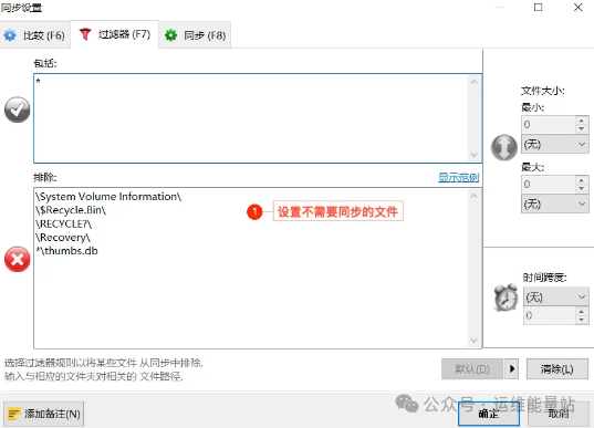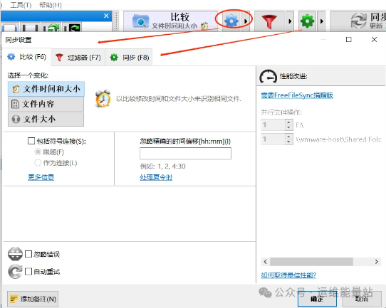 3. 选择同步模式点击中间的齿轮图标可以设置同步规则,FreeFileSync提供三种同步模式: ① 双向同步(Two way)