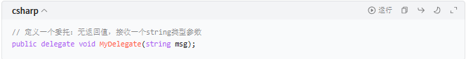 用delegate关键字定义,语法和方法声明类似,只是没有方法体,格式:这里定义的MyDelegate就是一个自定义委托类型,它约束了:能被它引用的方法,必须是无返回值、只有一个 string 参数的。