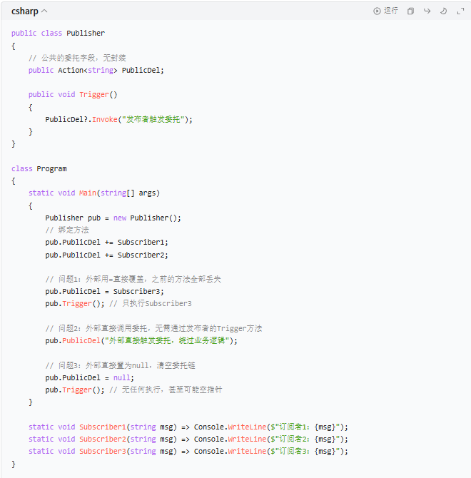 3.外部无法将事件置为 null:避免外部随意清空订阅者;