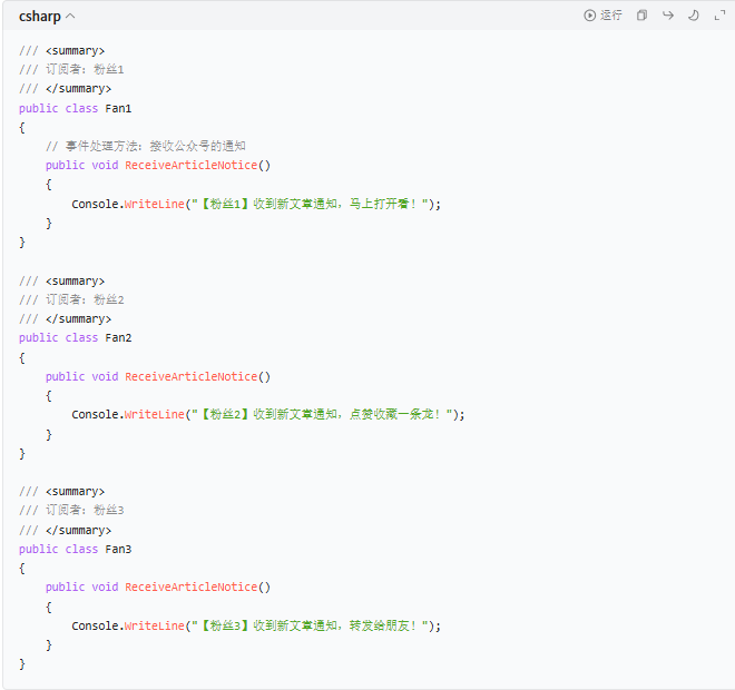 2.外部无法直接调用事件:只能由发布者自己在内部触发(比如示例中的OnArticlePublished方法),保证触发逻辑的可控性;