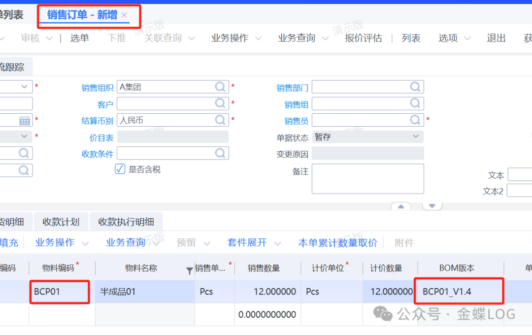 二、订单BOM版本携带规则 在销售、生产、委外等业务单据中,一旦选定某个物料编号,系统会自动携带该物料的最高版本的BOM。 这意味着后续的MRP运算生成的用料清单都将以此版本的BOM明细为准进行展开和计算。这确保了业务执行时默认使用当前最新定义的产品结构。