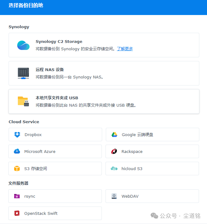 需特别注意:文件夹内挂载的其他设备文件夹无法备份,例如在 File Station 中挂载的 SMB 共享文件夹、NFS 文件夹,这类数据需通过对应设备的备份工具单独处理。 备份目的地:多场景覆盖,按需选择更高效 Hyper Backup 提供了丰富的备份目的地选项,不同备份内容对应的目的地有所差异,结合自身场景选择即可,同时提醒一个关键注意点。 ✦文件夹与套件备份目的地 选择范围最广,可适配个人、家庭及中小企业场景: • 跨设备备份:另一台群晖设备(适合异地备份、设备冗余); • 本地备份:群晖本地共享文件夹、外接 USB 设备(U盘、移动硬盘,适合快速备份、离线归档); • 公有云备份:京东云、S3 兼容存储设备等主流公有云服务; • 文件服务器备份:支持 rsync、WebDAV、OpenStack Swift 协议的文件服务器,适配企业现有存储架构。 ✦完整系统备份目的地 针对国内用户,目前仅支持备份至另一台群晖设备,建议用于企业双机冗余、重要系统异地备份场景。 ✦LUN 备份目的地 支持两类目的地:另一台群晖设备(跨设备冗余)、群晖内部共享文件夹或 USB 设备(本地归档、快速恢复)。