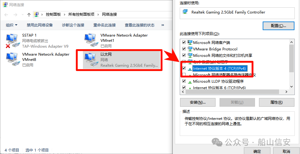 3. 右键点击→选择"属性"→双击"Internet 协议版本 4 (TCP/IPv4)"
