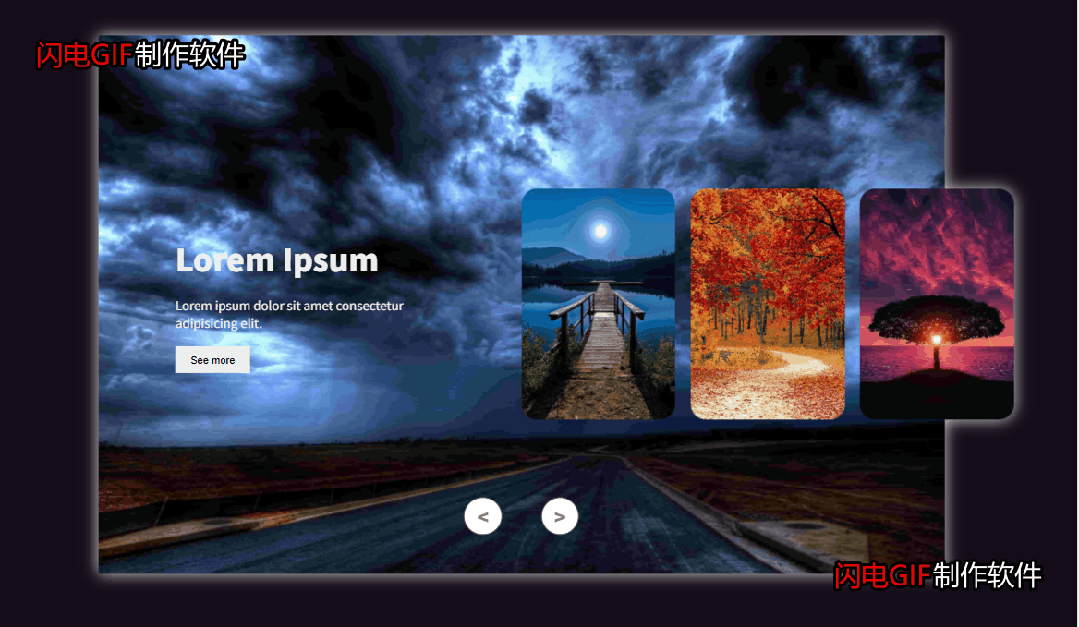 * { margin: 0; padding: 0; box-sizing: border-box;}:root { background-color: #150c1a; overflow: hidden;}.container { width: 1100px; height: 700px; position: absolute; top: 50%; left: 50%; transform: translate(-50%, -50%); padding: 50px; filter: drop-shadow(0 0 10px #dbdbdb);}.slide { width: max-content; display: flex;}.item { background-repeat: no-repeat; width: 200px; height: 300px; background-position: center; background-size: cover; position: absolute; top: 50%; margin-top: -150px; border-radius: 20px; transition: 0.5s;}.item:nth-child(1),.item:nth-child(2) { top: 0; left: 0; width: 100%; height: 100%; margin-top: 0; border-radius: 4px; box-shadow: none;}.item:nth-child(3) { left: 50%;}.item:nth-child(4) { left: calc(50% + 220px);}.item:nth-child(5) { left: calc(50% + 440px);}.item:nth-child(n + 6) { opacity: 0; left: calc(50% + 660px);}.item .content { position: absolute; width: 300px; left: 100px; top: 50%; transform: translateY(-50%); color: #eee; display: none;}.item:nth-child(2) .content { display: block;}.item .name { font-size: 40px; font-weight: 900; opacity: 0; animation: show 1s ease-in-out 1 forwards;}.item .des { margin: 20px 0; opacity: 0; animation: show 1s ease-in-out 0.3s 1 forwards;}.item button { padding: 10px 20px; border: none; opacity: 0; animation: show 1s ease-in-out 0.6s 1 forwards;}.btns { width: 100%; position: absolute; bottom: 50px; margin-left: -50px; display: flex; justify-content: center;}.s-btn { width: 50px; height: 50px; line-height: 50px; text-align: center; color: gray; background-color: #fff; font-size: 25px; border-radius: 50%; margin: 0 25px; cursor: pointer; font-weight: 900; border: 1px solid #555; transition: 0.5s;}.s-btn:hover { background-color: #ccc;}.item1 { background-image: url('./images/1.jpg');}.item2 { background-image: url('./images/2.jpg');}.item3 { background-image: url('./images/3.jpg');}.item4 { background-image: url('./images/4.jpg');}.item5 { background-image: url('./images/5.jpg');}.item6 { background-image: url('./images/6.jpg');}@keyframes show { from { opacity: 0; transform: translateY(100px); filter: blur(10px); } to { opacity: 1; transform: translateY(0); filter: blur(0); }}