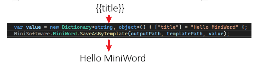 var value = new Dictionary<string, object>(){["title"] = "Hello MiniWord"};